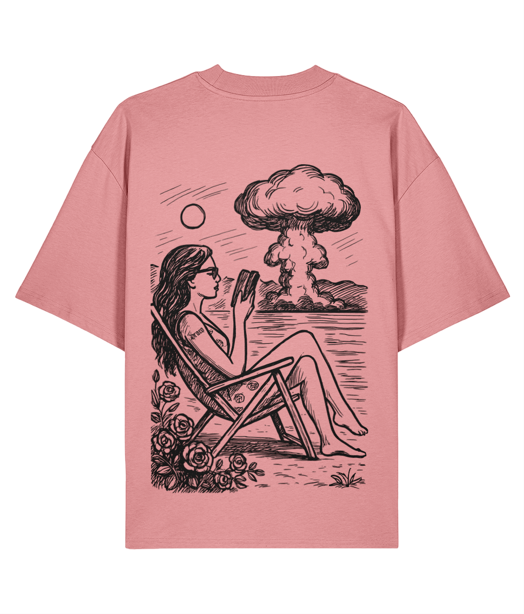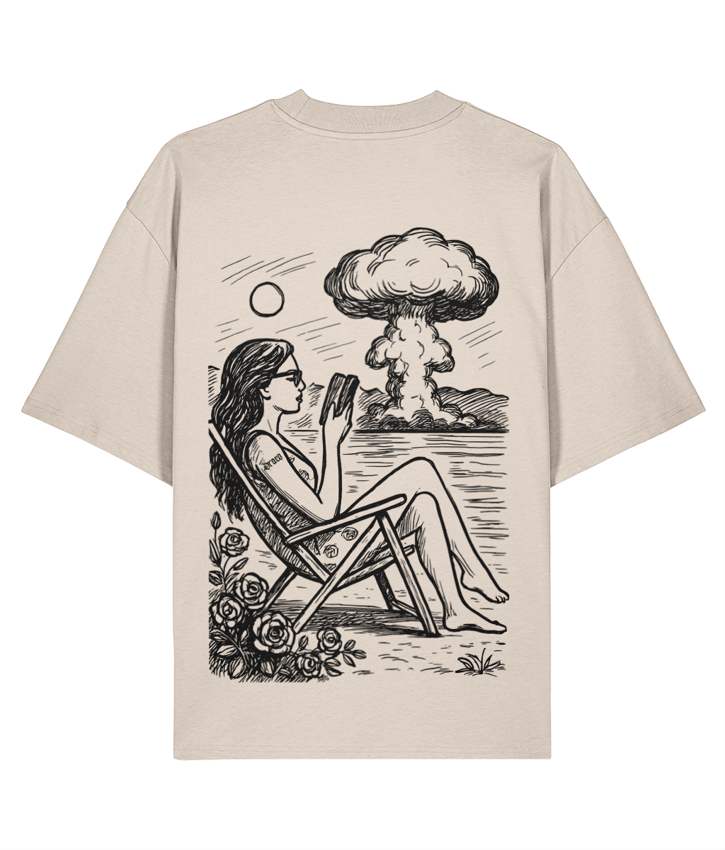 The back print depicts a calm figure reading by the shore while a nuclear explosion rises in the distance — a surreal reflection of peace and chaos coexisting. Hand-drawn detail and bold oversized fit make this shirt wearable art.