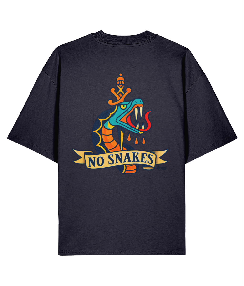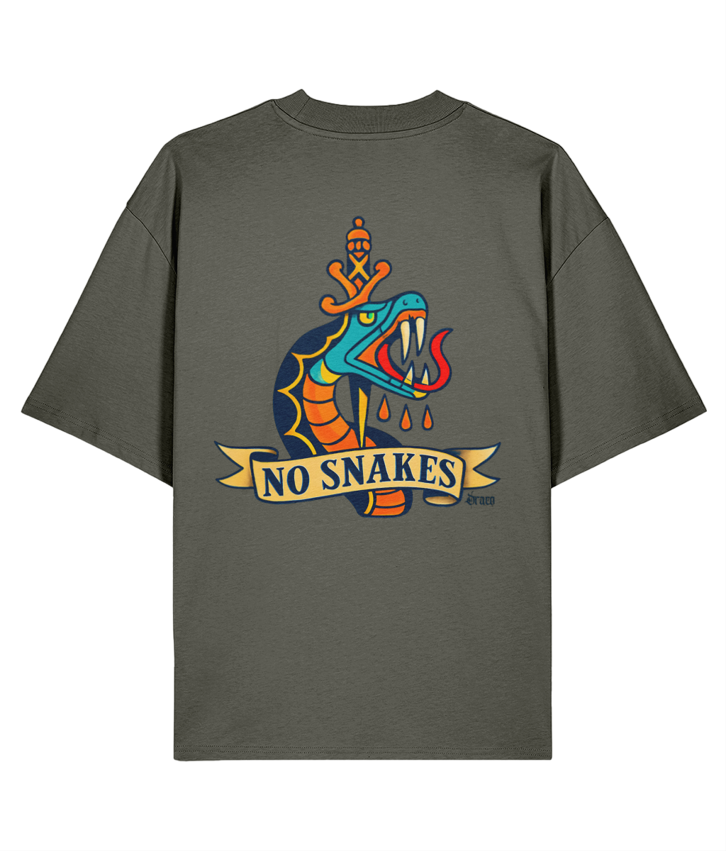 The No Snakes Oversized Tee by Draco Club is a bold tattoo-inspired streetwear piece. Featuring a colourful snake back print and “No Snakes” banner, this oversized unisex shirt is crafted from soft organic cotton — a statement fit with attitude.