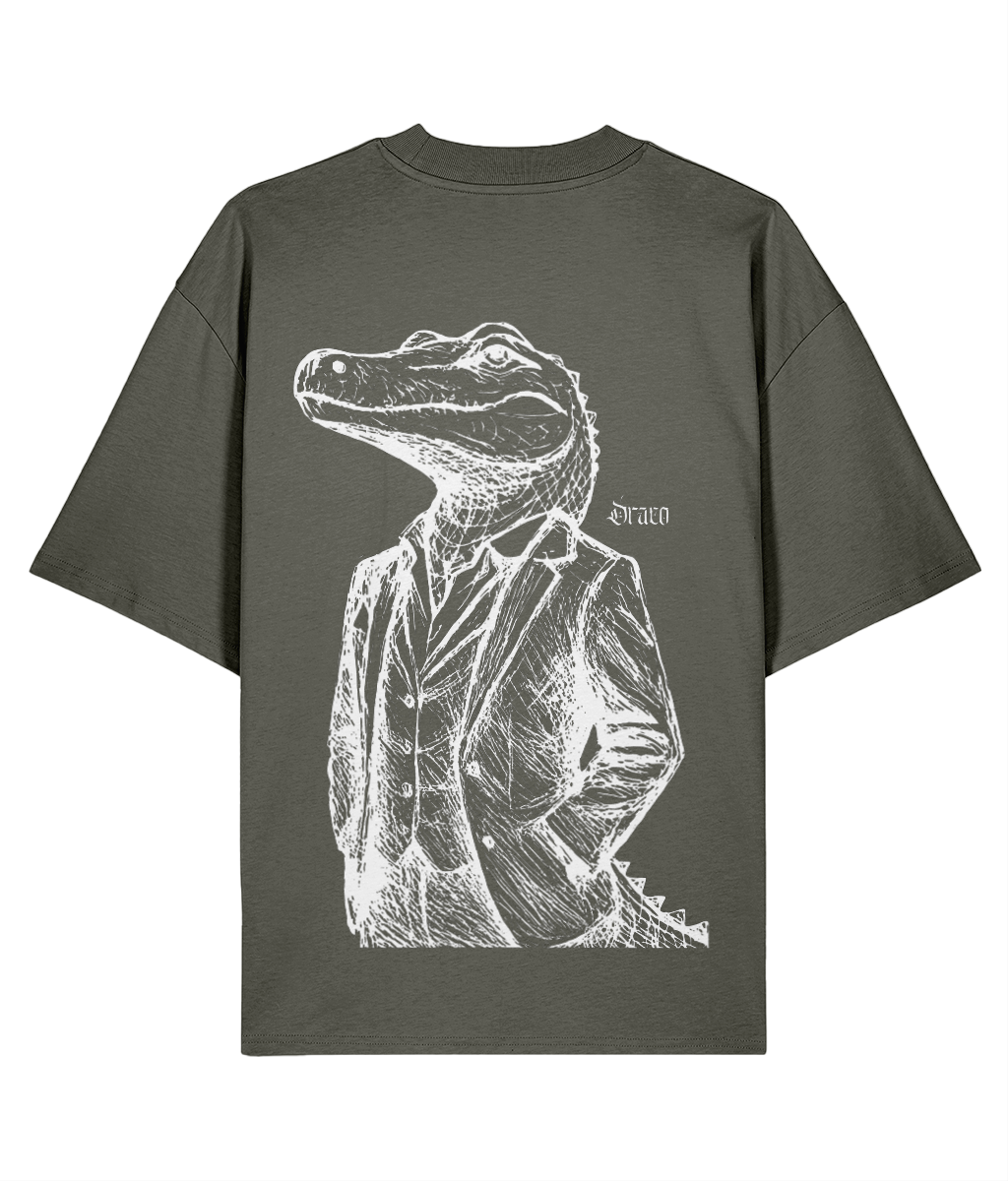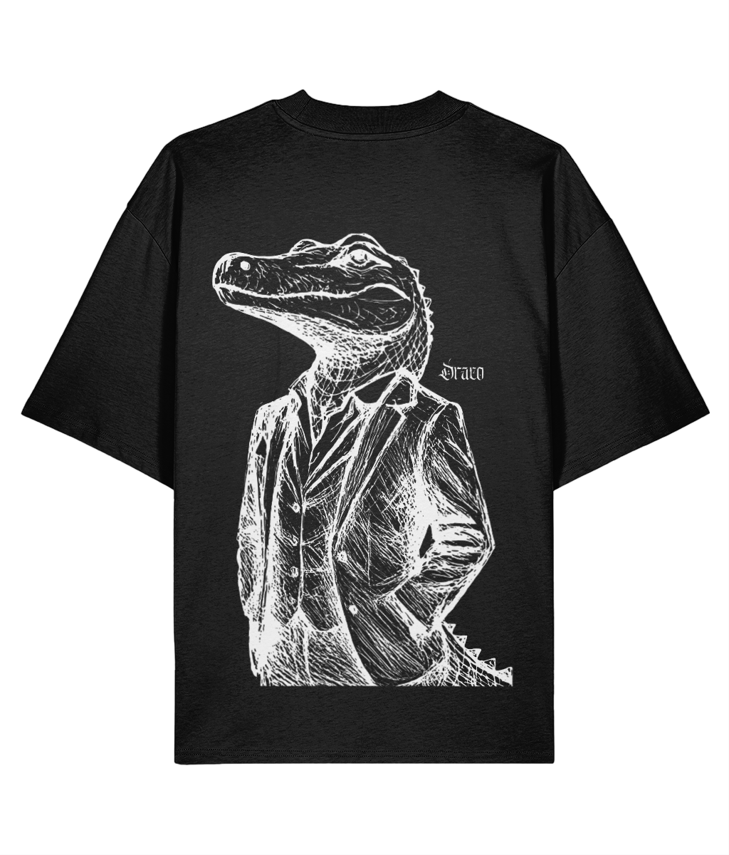 The Primal King Oversized Tee by Draco Club commands presence. Featuring a sharp alligator dressed in a tailored suit, this oversized unisex shirt is crafted from organic cotton — a surreal crossover of primal strength and streetwear sophistication.