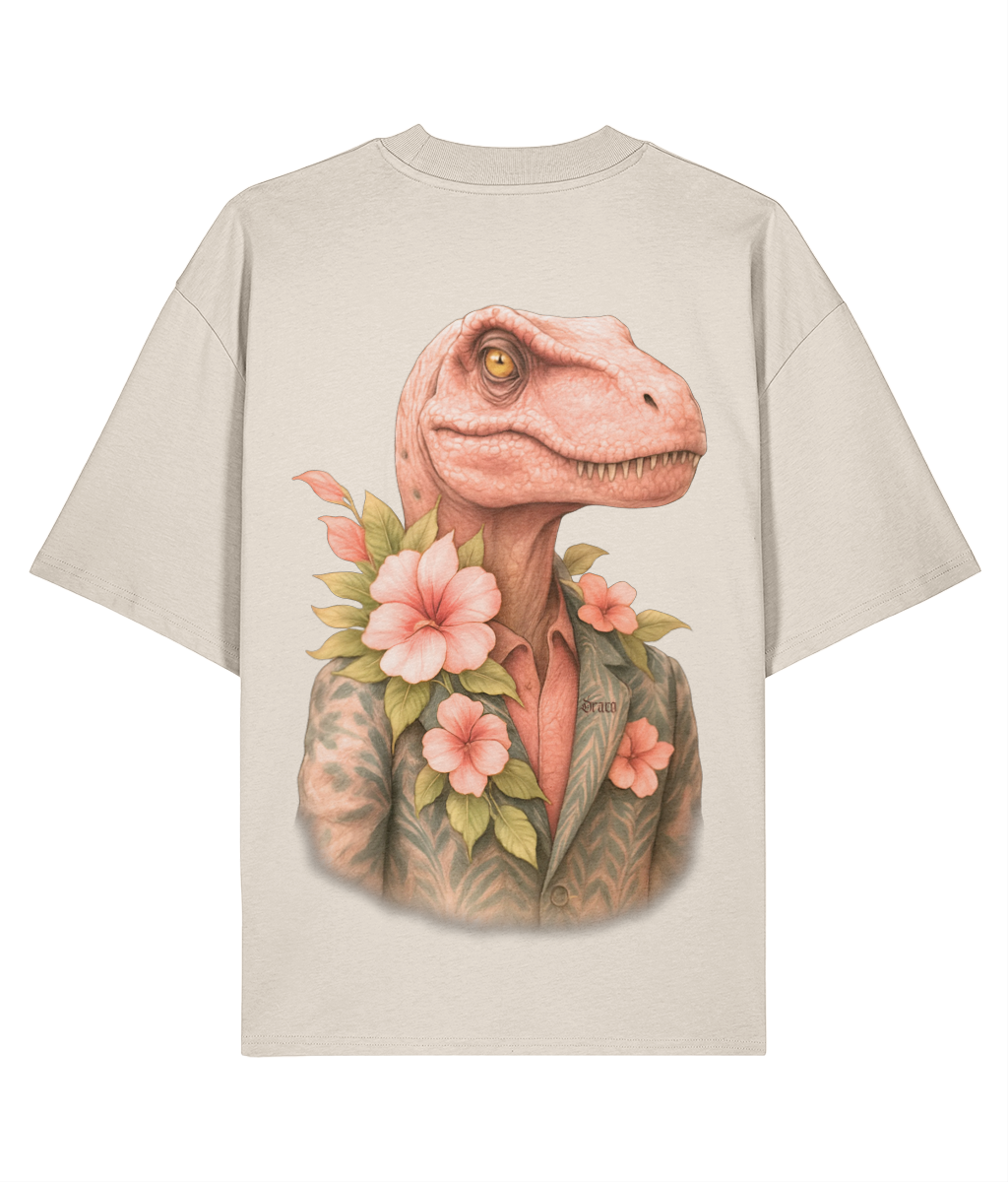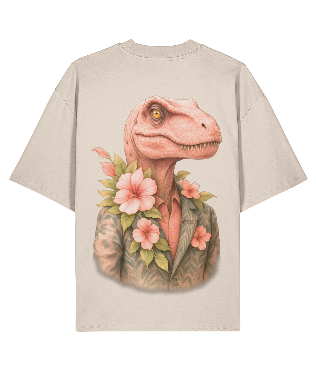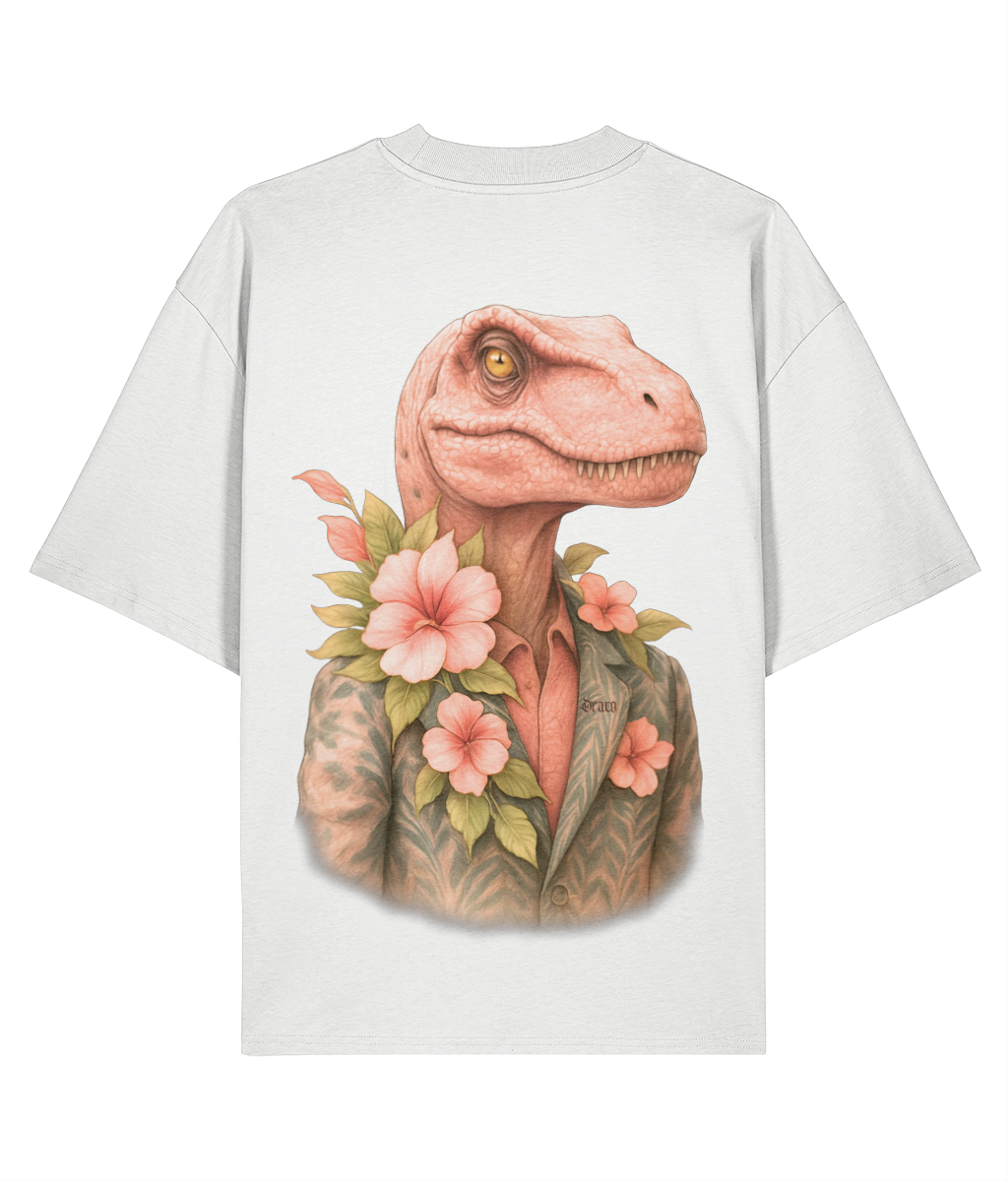 This tee doesn’t follow trends—it devours them. Featuring a hyper-detailed velociraptor in a floral suit jacket, surrounded by lush pink blooms and green leaves, ‘Raptor Bloom’ is a visual paradox: savage meets suave. The pink-toned head and tropical palette add a playful twist to the beast’s dominance, making it perfect for those who wear contradiction with confidence.