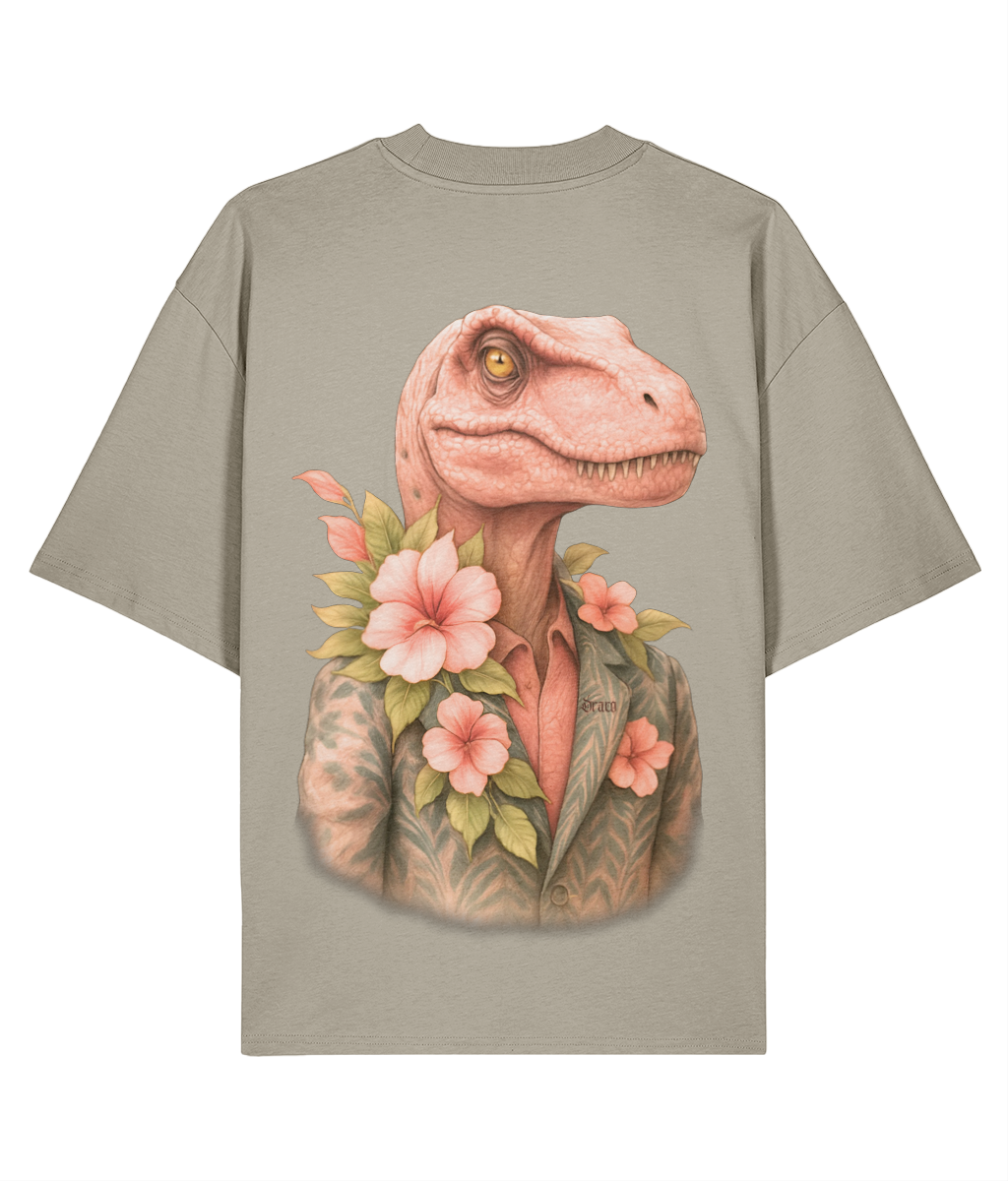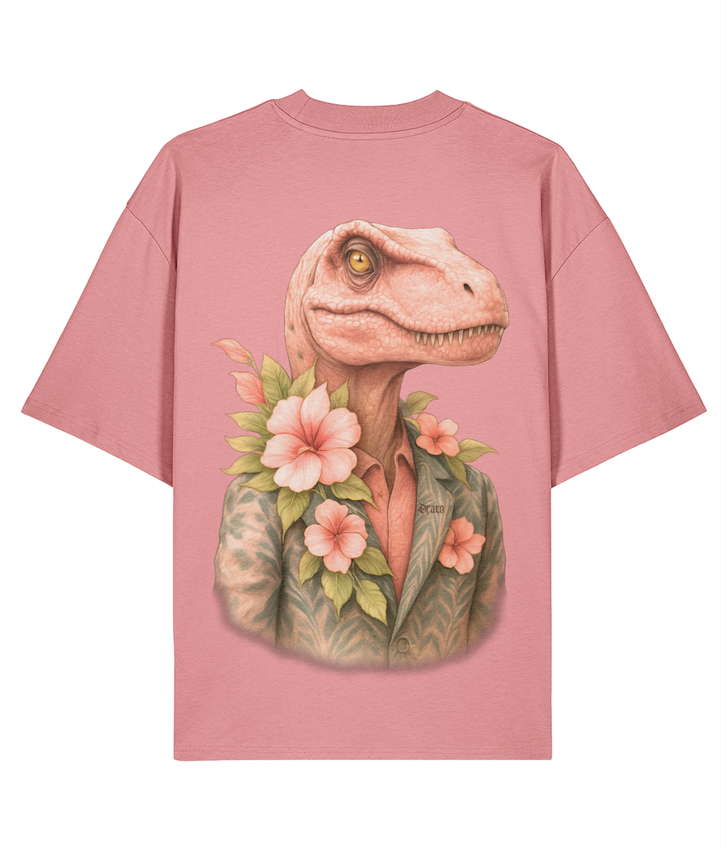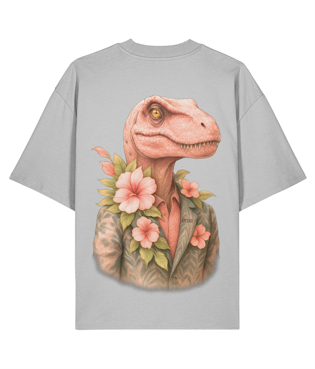 This tee doesn’t follow trends—it devours them. Featuring a hyper-detailed velociraptor in a floral suit jacket, surrounded by lush pink blooms and green leaves, ‘Raptor Bloom’ is a visual paradox: savage meets suave. The pink-toned head and tropical palette add a playful twist to the beast’s dominance, making it perfect for those who wear contradiction with confidence.