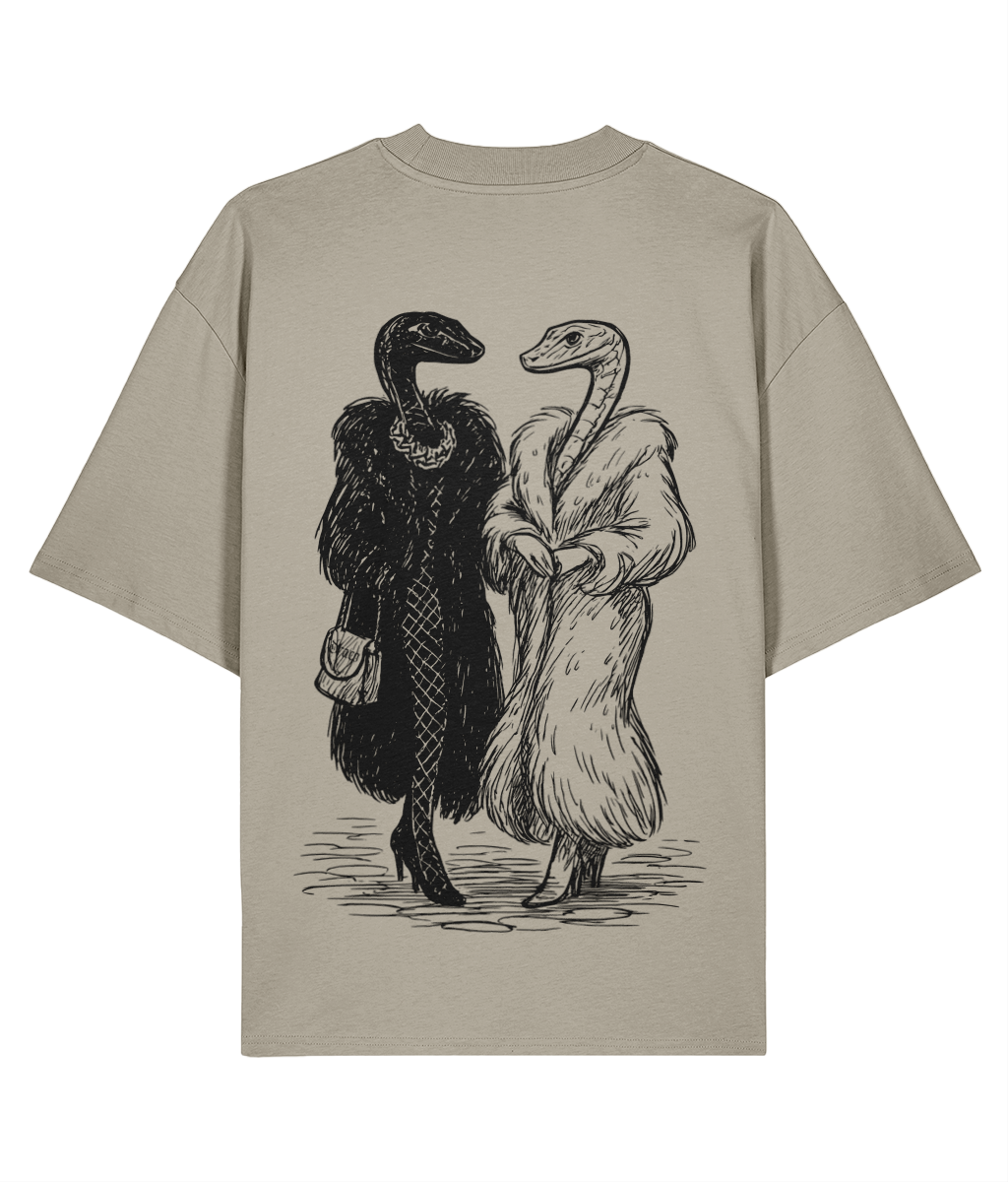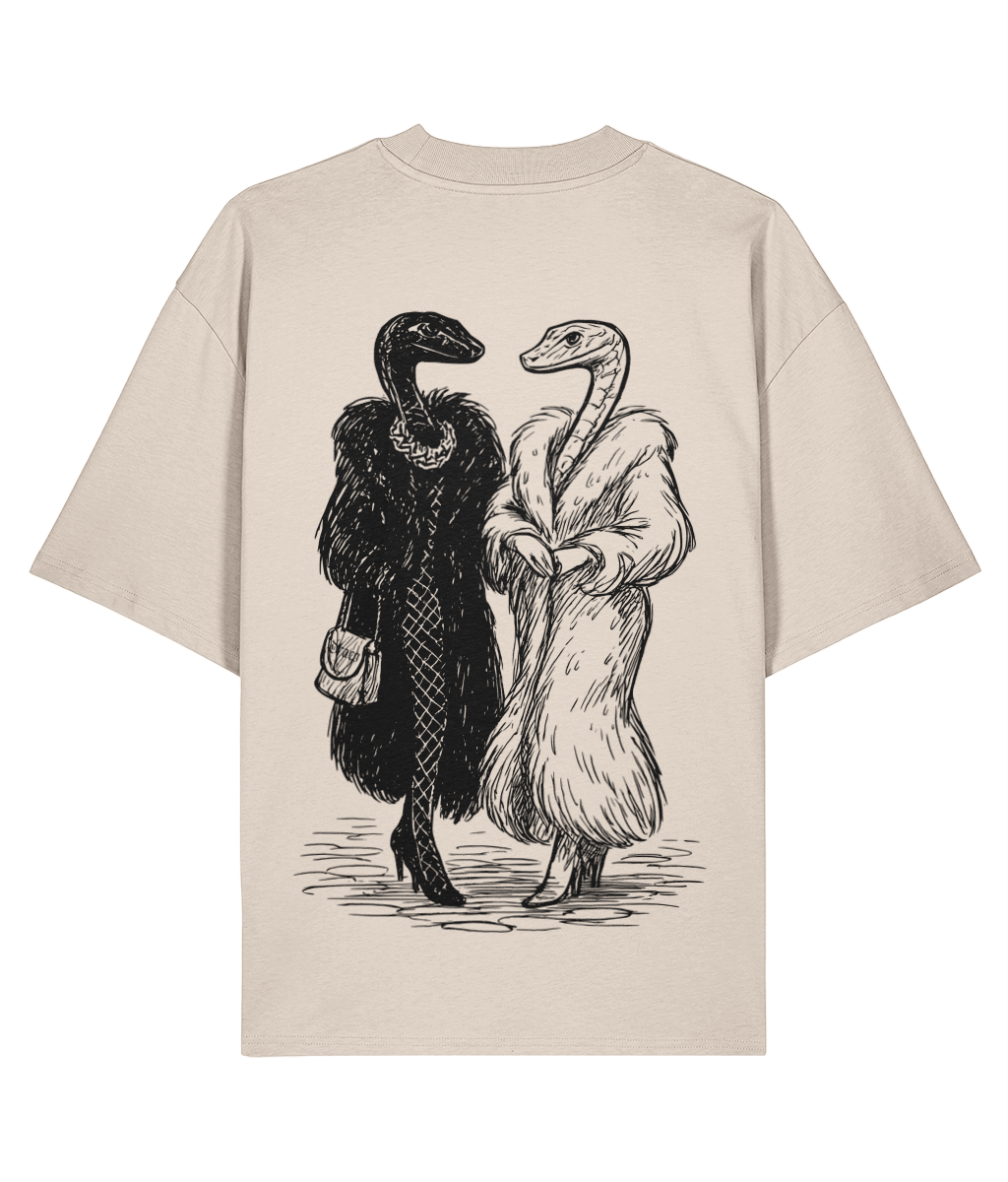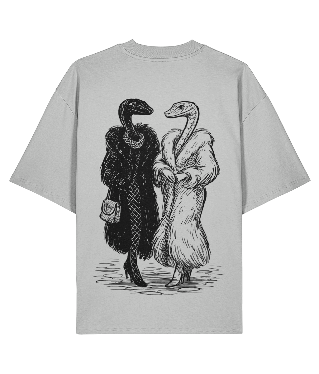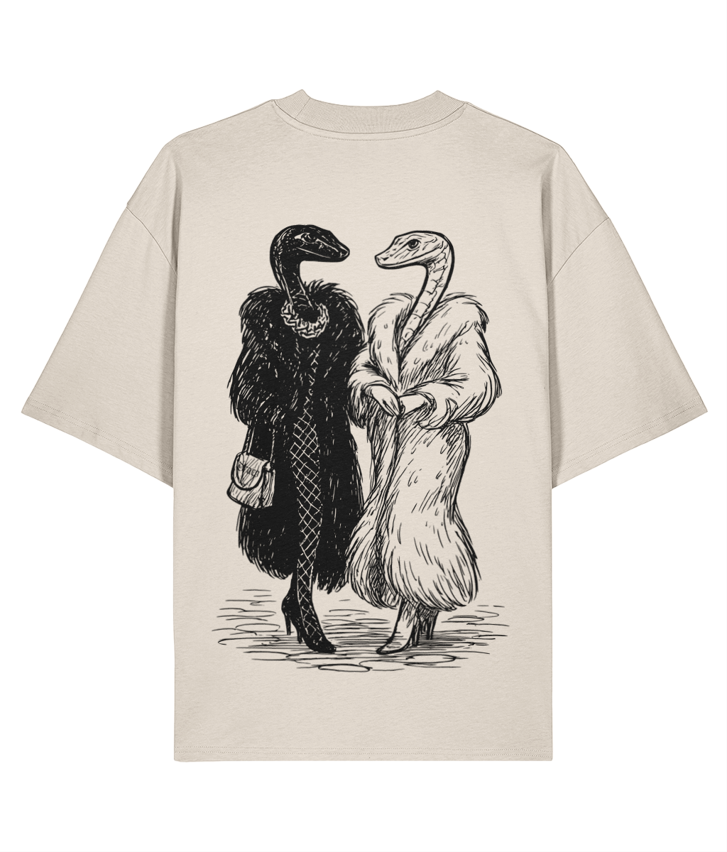 The Yin Yang Venom Oversized Tee by Draco Club blends surrealism with street chic. Printed on organic cotton, this oversized unisex shirt features two snakes in high-fashion fur coats — a bold back print that flips elegance and danger into streetwear art.
